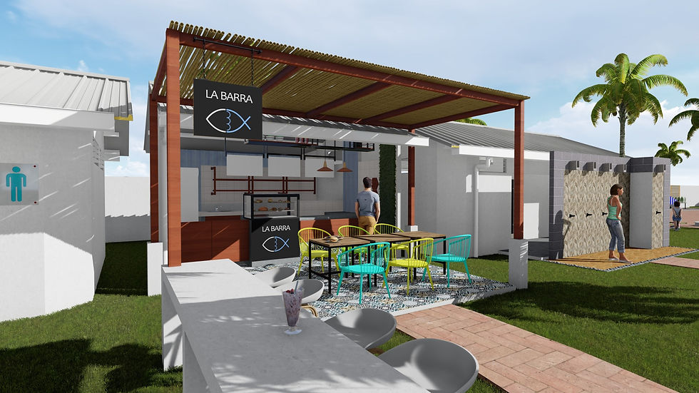 En el sector de consumo de alimentos se disponen 6 sillas plásticas coloridas con brazos y 3 mesas con cubierta en melamina. Ademas se propone una barra exterior con vista al mar, cuya cubierta es de 4 cm en microcemento sobre paredes de bloque saltex de 10 cm acabado pintado en excello aceite satinado 50% s.w. y 4 bancos con asiento plástico.